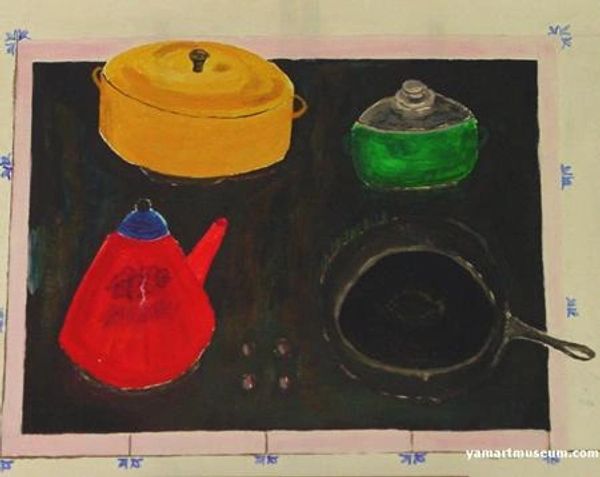 The range top has turned into a river flowing between the cookware. Note the trees on pan ridge. There is a tempest in the teapot. 19x24