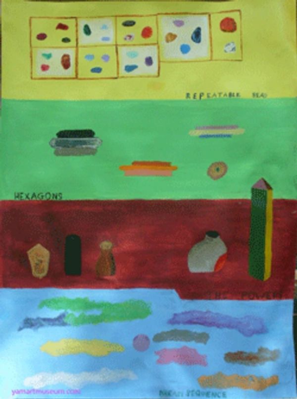 21 x 28 The real dream sequence is the Hexagons. I dreamt of hexagons that were greatly elongated horizontally, practically into rods, and then stacked in threes. The work is on poster board, because it was painted around the turn of the century, before I started using canvas, unfortunately undated. It even got wet when the sunroom roof sprung a leak. I did not post it for years because I thought it was moronic and juvenile, but I am slowly changing my mind.