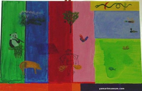 Stylized, stereotypical Chinese images, harmoniously arranged. The primary point was to have a red stripe next to a pink stripe. The world's skinniest dragon top right. 20x30 .