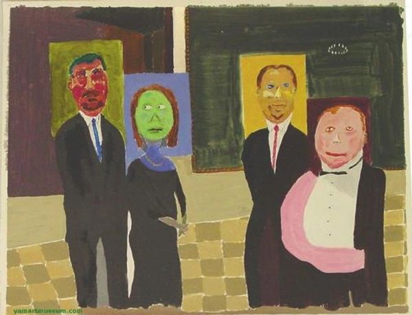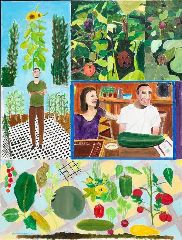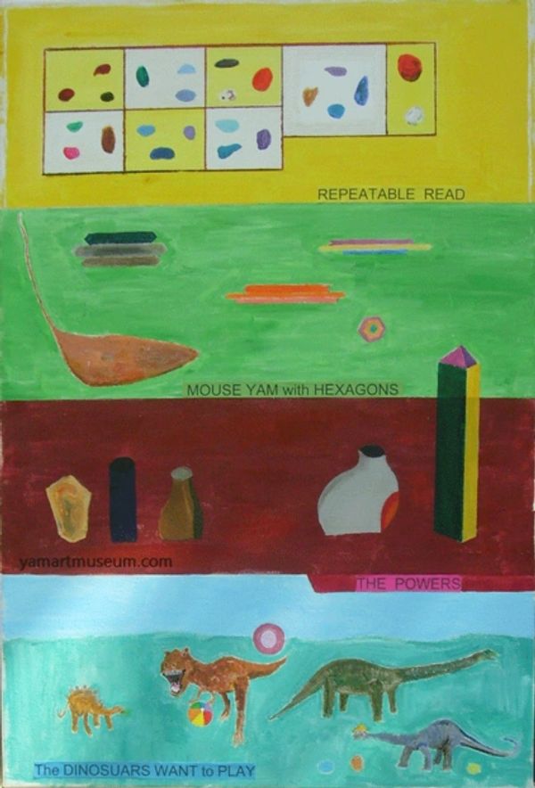 24 x 30 June 2012 A reproduction of 4 Little Weirdos, on canvas and slightly larger. It has the Mouse Yam, which I discovered in Burlington NC on Mayday when I was helping a little old lady pick out sweet potatoes for her dinner. Also the bottom panel is transformed. The canvas was originally intended for Cousin Bernie, but it was too small