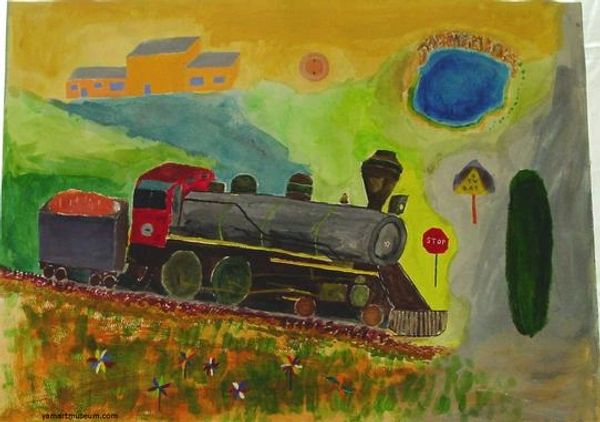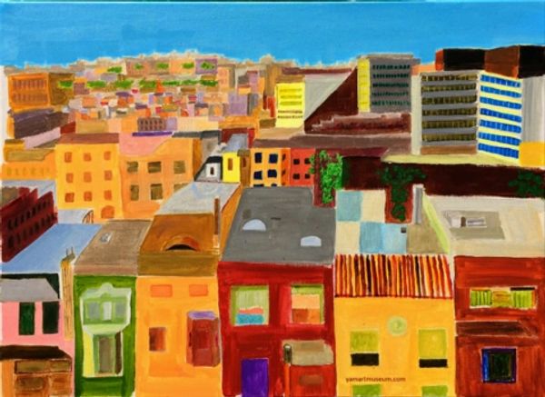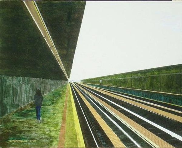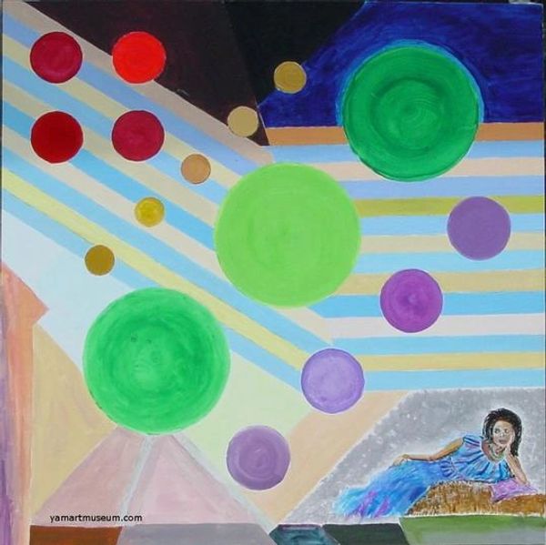 As originally conceived, this picture was vertical, not horizontal. There was an ocean to the left, and a city to the right, of the beach. Fruits were welcome guests, and cooling polka dots were rolling off the sea onto the land. But I realized that without my intending to, the sea had turned into a four-eyed worm eating Michael Quigli's grape! (See 2WOIQ.) This led to notions of property rights, arbitrary property rights, trespassing and the consequences thereof, as expressed in the final version, which has a more somber tone than is usual in my paintings. (Michael Quigli and his ridiculous grape are completely fictitious, although there are several real Michael Quigleys.)