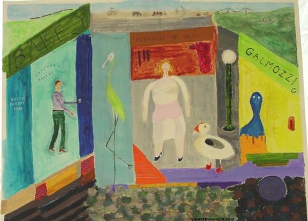 Inspired by the Butcher, the Baker, and the Candlestick maker. The latter has become a ghost upon seeing the puffin. The tall bird is a cormorant. Painted Spring of 2002. The bakery is Lucinda's Bakery, run by David Dagney. If you think the Albanese Butcher's pink underwear violates the Museum's no nudity policy, no, I was trying to achieve the layered look.19x24