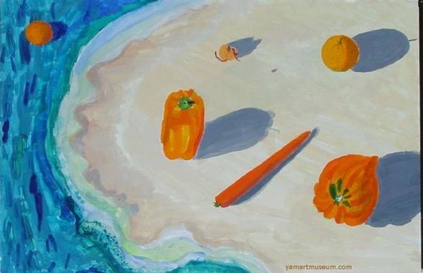 To prevent overcrowding, Vegetable Beach restricts admission to a different color of vegetable each day. The orange gained admittance on a technicality. "Hey, today is Orange Day, and I'm an orange". But the tangerine did not want to risk the worm police, after seeing what happened to the foolhardy apricot. Also notice the remnants of a grape.