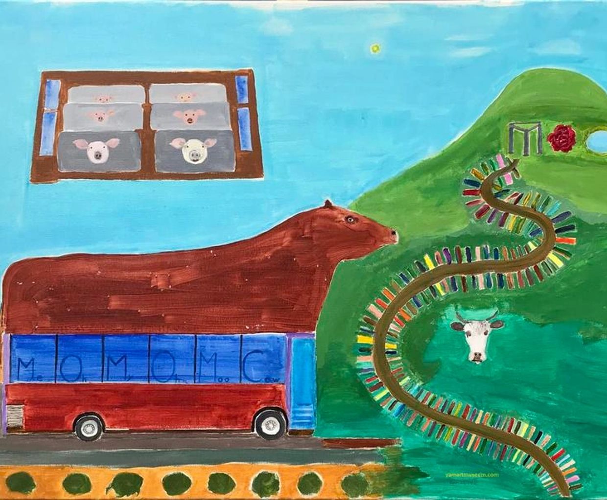 30x40 Nov 2021 On the night of 10/3/2021 I was too obsessed with the phrase “me-oh-my-oh-moo cow” to fall or stay asleep. And five days later, I had a vivid dream of a trail with multicolored railings coming down a mountain. Hence this vision of a bus that has become a cow. On the back of each seat is a pig-shaped steering wheel that goes oink when you press it.